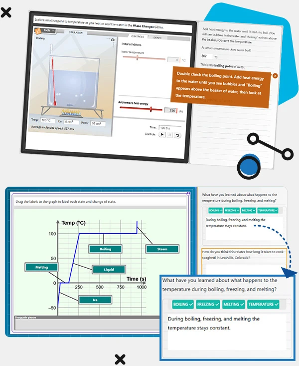 These investigations bridge gaps in science education, offering efficient practice for Science and Engineering Practices (SEP) mastery and actionable insights for differentiation. Students learn like scientists through active experimentation and inquiry, deepening their understanding and building connections across science disciplines. This kind of scientific sensemaking spells success. Interactive Gizmos Investigations are centered on student-driven Investigations of real-world phenomena.